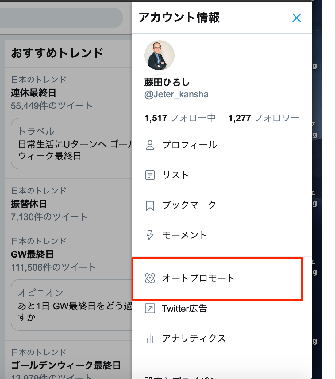 いろいろ調べて、ようやく自分のアカウントのメニューに「オートプロモート」が表示されているのに気付きました。